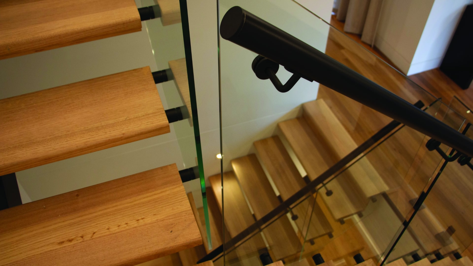 Featuring a central structural spine for clean, cantilevered lines, the design is complemented by frameless glass balustrades with discreet stainless steel button fixings for a refined, uninterrupted look. Finished with sleek 50mm round black aluminium handrails, the entire system balances strength, transparency, and contemporary styling— engineered for performance and built to impress.